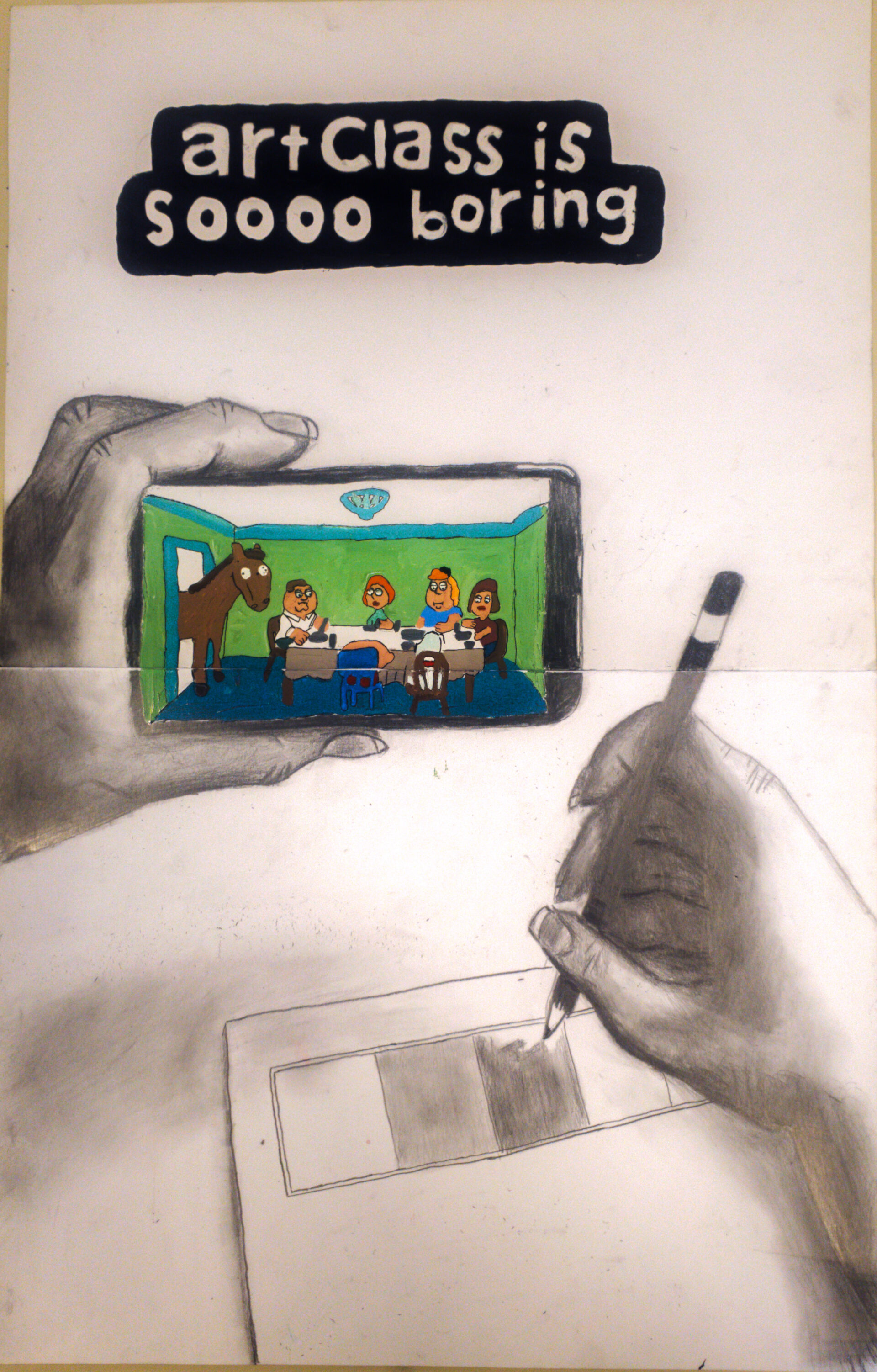 I had to draw something based on a societal issue. I used this as an opportunity to make a piece about social media use and art education. Acrylic for family guy, graphite for hands.