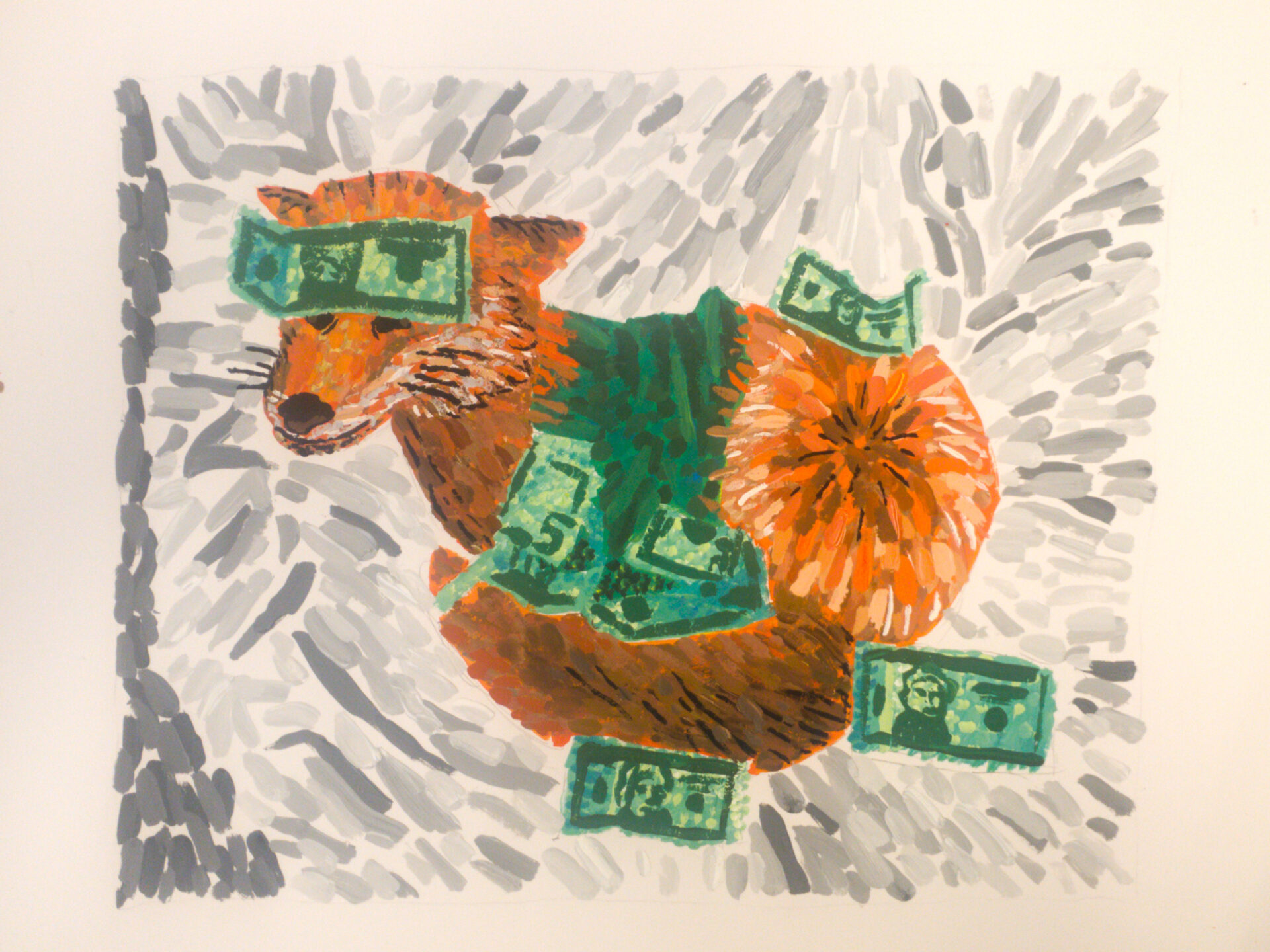 This class project was about painting in short strokes to make colorful dithering effect. I saved an image of a fox with money on it and that happened to fit with the prompt.